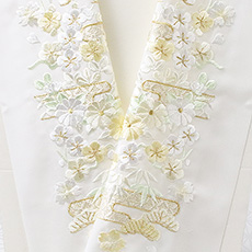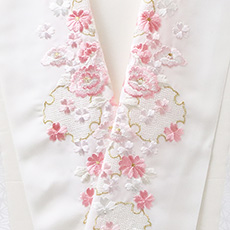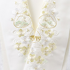 お手入れのしやすいポリエステル地の刺繍半襟です。 華やかな刺繍を襟元に添えてお出掛けくださいませ。