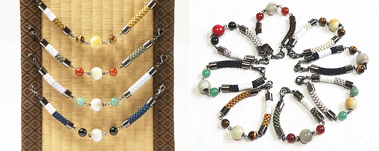 下記のカラーをクリックするとそれぞれの詳細画面が表示されます。 | | | 金茶/トラ目石 (01) 9,680円(税込) | 松葉緑/赤メノウ (02) 9,680円(税込) | 松葉緑/オニキス (03) 9,680円(税込) | | | | | | | 灰青/赤メノウ (04) 9,680円(税込) | 灰青/アベンチュリン (05) 9,680円(税込) ご好評につき売り切れ | 灰青/オニキス (06) 9,680円(税込) | | | | | | | 濃紺/オニキス (07) 9,680円(税込) | 黒/赤メノウ (08) 9,680円(税込) | | | | |