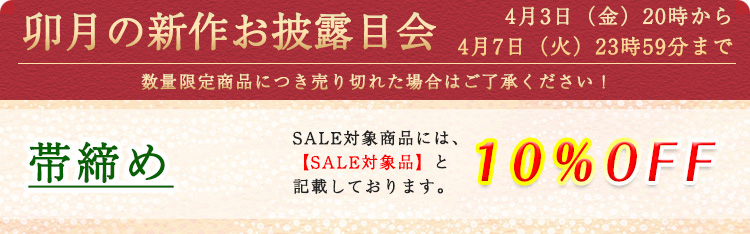|  太高麗振袖さくら【SALE対象品】 圧倒的なボリュームと華やかさのある振袖にお勧めしたい帯締め |  つばき【SALE対象品】 「椿」をデザインした可愛くも本格的な帯締め |  三色ちりめん【SALE対象品】 各々ベースとなる1色に2色の色糸を絡めて組んだ「ちりめん」帯締め |