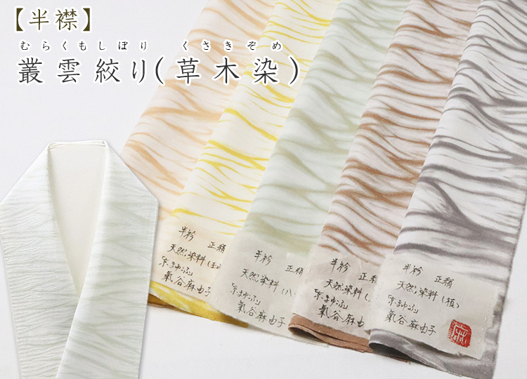 この半襟は京都で<京まゆこふ>のブランドで活躍されている<氣谷麻由子>さんの作品。 <草木染め>で<叢雲(むらくも)絞り>を使って染められた半襟です。 月桃・薩摩杉・木蓮・柿・玉ねぎ・・・ 様々な天然植物を染料として染める<草木染> 各々の植物本来の色素と、媒染剤の反応で、実に様々な色彩に染め上ります・・・。 四季の移ろいが美しいこの日本で育つ植物たち。 科学染料とは一味違う天然素材を使った、草木染ならではの色彩の奥深さと温もりを感じていただければ幸いです。 草木染のお品物は、お使いいただくほどにお色目の経年変化が楽しめるのも魅力のひとつです。