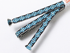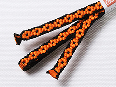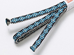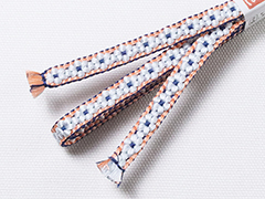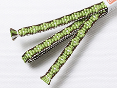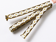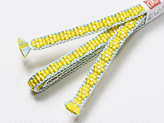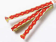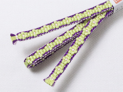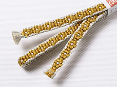 しなやかさの中にも適度なハリが感じられるのは手組み紐ならではの風合い。 また、この紐は組織上、ぽってりとした小桜柄を表現するために凸凹とした厚みが生まれます。 この厚みの効果で、帯の上で帯留めが滑らず、しっかり固定できるのもこの紐の魅力です。 さらに、帯留めに通しやすいように、片側の紐の端は、短く平房に仕上げるという作者の心遣いが嬉しい。