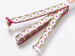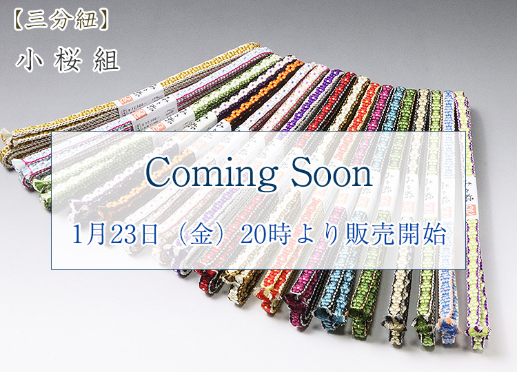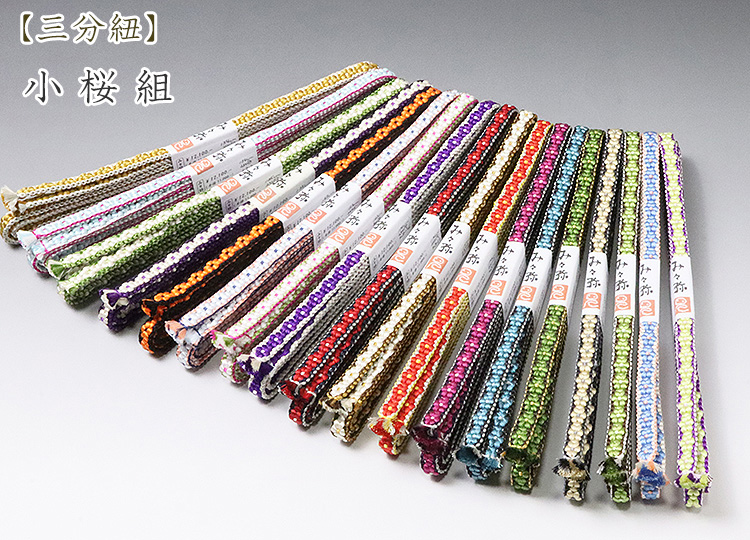 前回あっという間に完売した「小桜三分紐」 ようやく再販が叶いました。 各々、三色使いで一本一本丁寧に組み上げられた「小桜組み」の三分紐は、 三分紐の中でもワンクラス上のお品物と言えます。 見てください!充分な糸使いから生まれた、六弁の花のぽってりとした可愛らしい表情と、整然と美しい小桜柄の並びを・・・ 一本一本に込められた、創り手のこだわりと技が光る本格的な一品です。