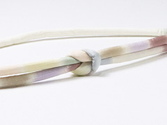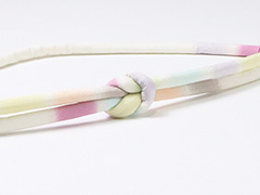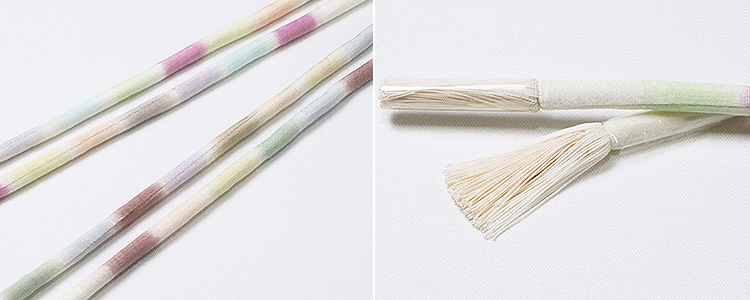 結んだ雰囲気が組紐の帯締めよりも柔らかな印象を与える<丸ぐけ>・・・ 帯揚げ「七色段ぼかし」とお揃いの「丸ぐけ」を創りました。 こだわりは、結んだ際に、七つの色がすべて顔を出すようにした点。