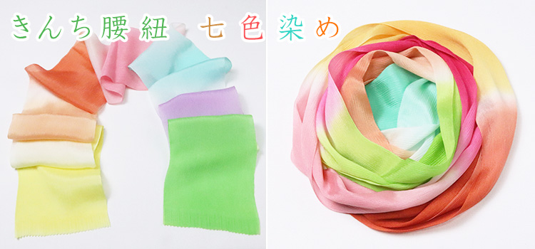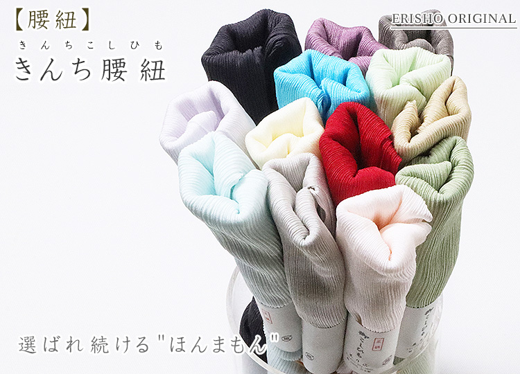 「着付教室の先生から勧められて買いに来ました・・・」と わざわざご遠方からご来店いただくお客様も増えてまいりました。 弊店のような小さな店舗が手掛ける商品が、全国の着付の先生方にご愛用していただけていることは、 本当に有り難いことですし、地道に創り続けてきてよかったと商いの励みにさせていただいております。 腰紐や伊達締めといったお道具は、着付けた後では見えない(見せない)モノ・・・。 縁の下の力持ち的な存在ですが、この地味で控えめなアイテムこそ最終的な着心地を左右する大切な小物です。 <見えないところ(見せないところ)にオシャレするのがほんまのオシャレ・・・> 是非一度お試しくださいませ。 また<七色染め>の商品は、昔から<魔除け・厄除け>の意味をこめて お使いいただいており、 ご進物にも喜んでいただいております。 「きんち(楊柳)」とは 「きんち(楊柳)」とは「縮緬」や「紋意匠」同様、生地の織り方の名称です。 ごく稀ですが、他所さんでも「きんちの腰紐」として販売されているのを見かけることもございます。 ただ失礼ながら、織り方の組織は同じであっても見るからに生地が薄く、 数回締めたら伝線したり破けたりするのではないかと感じるお品物が多いのは残念です。 弊店がご紹介している<きんち腰紐>は、これらとはまったくの別モノだとお考え下さい。 素材 絹100% 日本製 <ERISHO ORIGINAL>