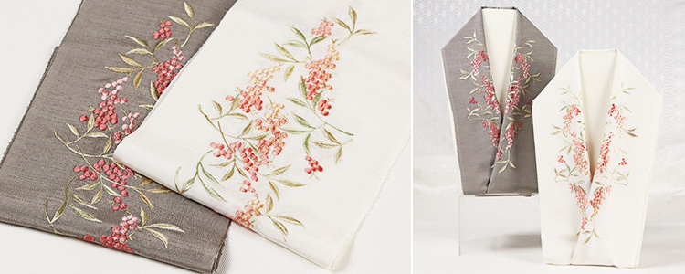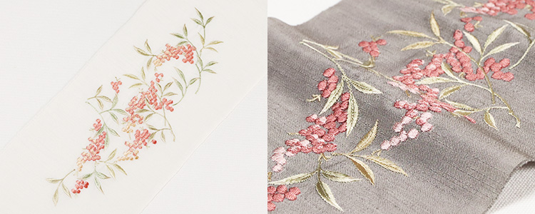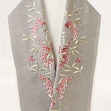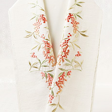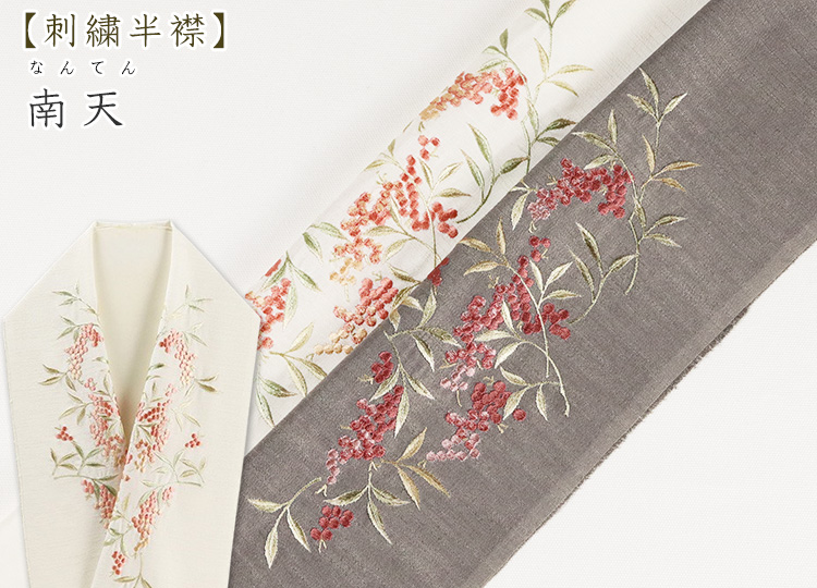 紬織りの生地に、たわわに実った南天を意匠した刺繍半襟。