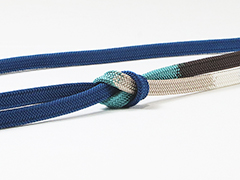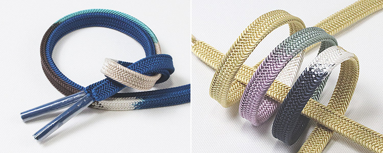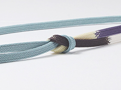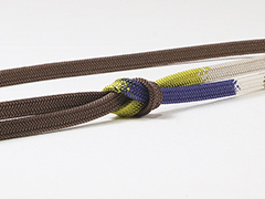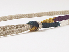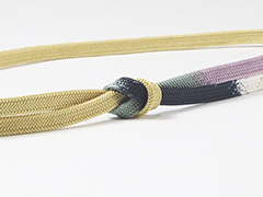 また地色に挟まれる格好で、三色を締め切って配色するという、お手間入りな加工が魅力。 着用時の四色のハーモニーが変化にとんだユニークな帯締めです。
