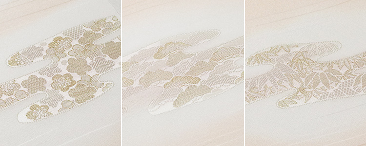 金糸の縫い取りで、松竹梅を表現したおめでたいモチーフの帯揚げ。