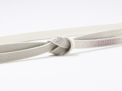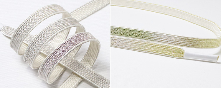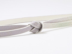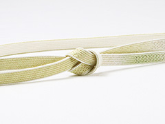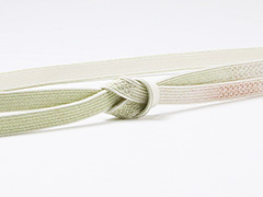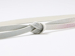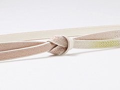 ようやく再制作が叶いました。 昨今ではこの商品のように、手組みできちんと組んでいただける加工場が本当に少なくなりました。 平打ち紐の代表格「高麗組」 片胴には、約8㎝間隔で「綾目」を入れてアクセントを付けました。 その綾目部分に、挿し色でぼかしを入れ、 着用時に、一方は無地、もう一方に挿し色を使ったぼかし、が出るように構成しました。 オフホワイトの両サイドの耳部分が帯を引き締め、 全体に細かく散らした金糸がフォーマル感をグッと押し上げてくれます。