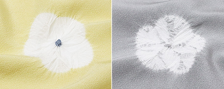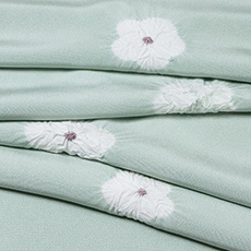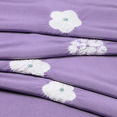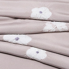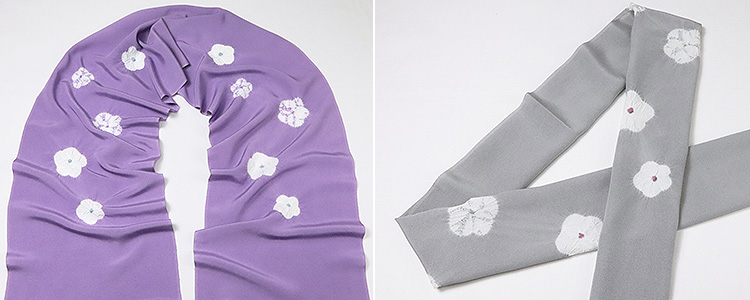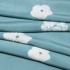 三越(みこし)素材に、片面に梅を5ツ(輪出し小帽子3ツ、傘巻き2ツ)絞った帯揚げ。 梅柄五ツのシンプルな校正でありながらも、 輪出し、小帽子、傘巻き、といった、絞り技の競演が見ごたえのある帯揚げと言えます。 また中老的なスモーキーな配色も魅力です。 帯まわりから、僅かしか顔を覗かせない帯揚げですが、 脇役でありながらも「アートを身にまとう」気持ちが大事。 そんな自己満足が、知らず知らずのうちに気姿にも滲み出てくるもの・・・。