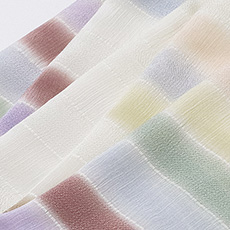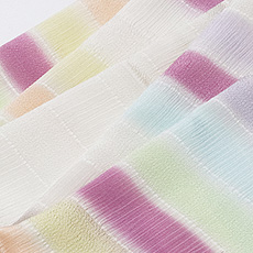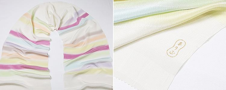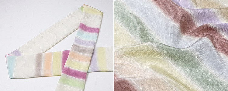 今回の作品を創るために別織りしたこの帯揚げは、 <縮緬>と<楊柳>が< 約4㎝ >間隔で交互に織られた味わい豊かな素材が魅力です。 一番のこだわりとして、 着用時に七色すべてが胸元に出てくれるように、左右で色の順列を変えた点。 職人泣かせの発注でしたが、構想通りの配列で綺麗に染め上ってまいりました。