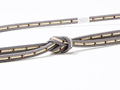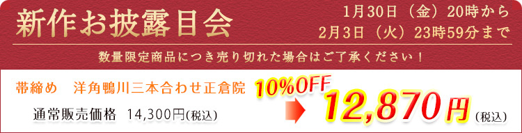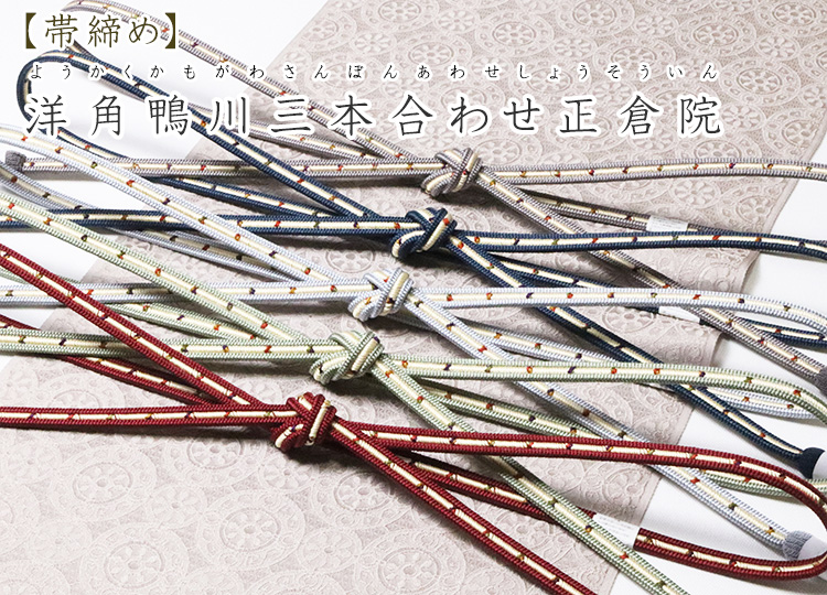![]() 鴨川組の細紐を、洋角組の細紐で挟んだ形状(三本合わせ)の帯締め。 真ん中を走る鴨川組には、通称「正倉院」と呼ばれる5色が、
