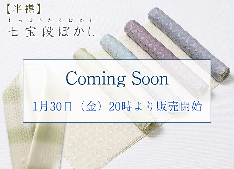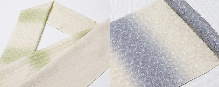 七宝柄の半襟を、段ぼかし仕上げした半襟。 上前下前に均等に来るように掛けるのも良し、 あえてずらして装うのも良し・・・。