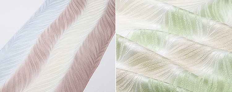 ふくれ織りで、孔雀羽にも似た「羊歯」の葉を表現した帯揚げ。