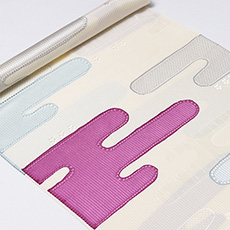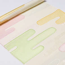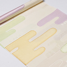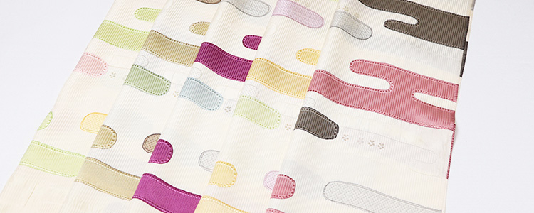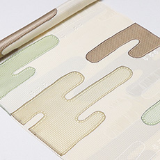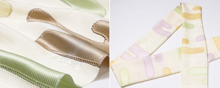![]() 経糸緯糸の整経に工夫を凝らして織り出された「ヱ霞」文様は、 地色にオフホワイトを染めてから、