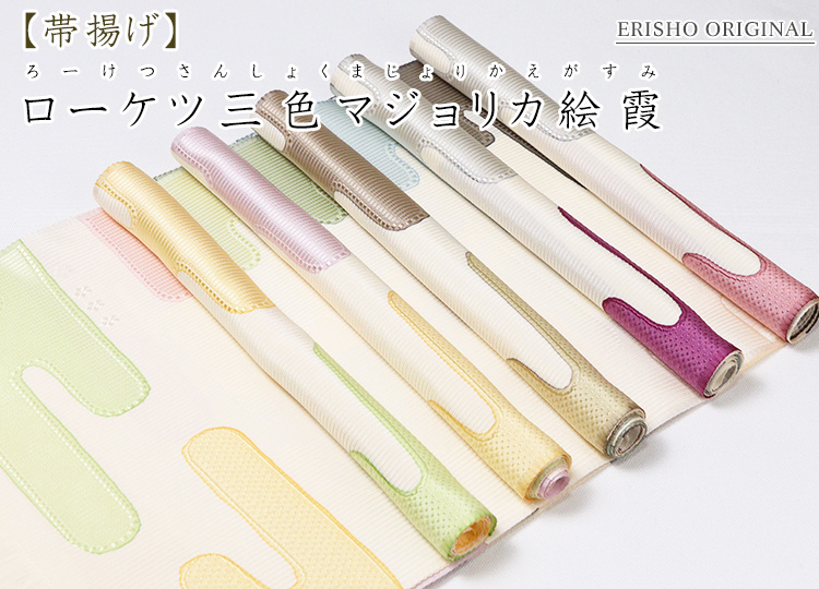 ヱ霞文様を拾うような格好で三色使いのローケツ染で仕上げた帯揚げ和装小物 > 帯揚げ > 帯揚げ ローケツ三色マジョリカ絵霞 商品の写真はお客様のモニタ環境により実物のものと若干異なる場合がございますので予めご了承ください。