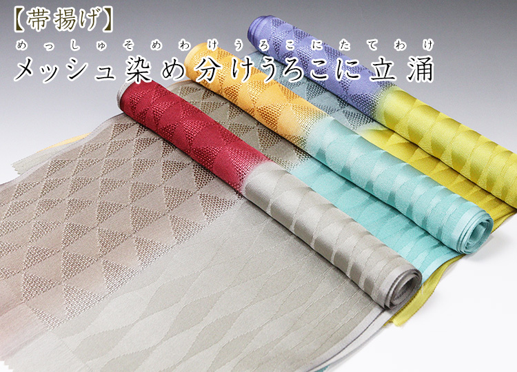 縦半分がうろこ柄のメッシュ、もう半分が立涌柄の紋意匠 と、凝った素材が魅力の帯揚げ和装小物 > 帯揚げ > 帯揚げ メッシュ染め分けうろこに立涌 商品の写真はお客様のモニタ環境により実物のものと若干異なる場合がございますので予めご了承ください。