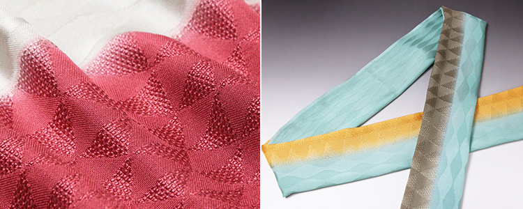 ![]() 縦半分がうろこ柄のメッシュ、もう半分が立涌柄の紋意匠 と、凝った素材が魅力。 中央、及びメッシュうろこの半々で染め分けしてあるので、