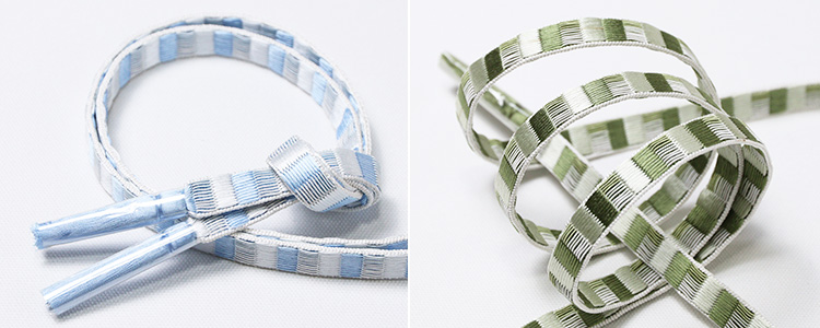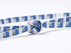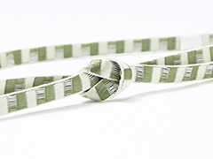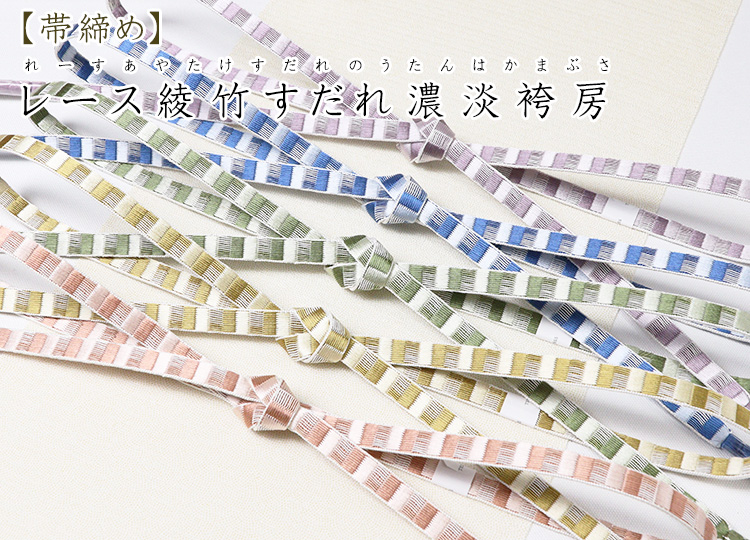 ![]() 綾竹組みを使って、撚り糸だからこそできる、すだれ柄を表現したユニークな帯締め。 濃淡色仕上げなので大人しく個性的な帯締めと言えましょう。