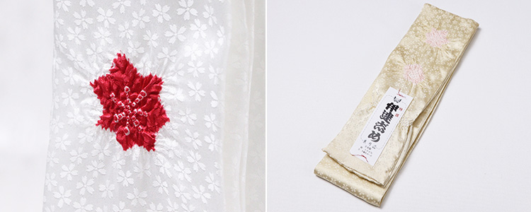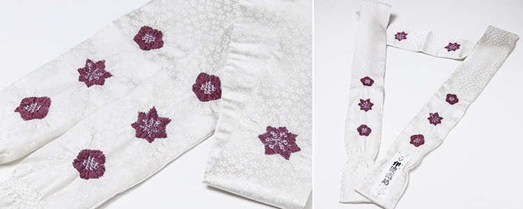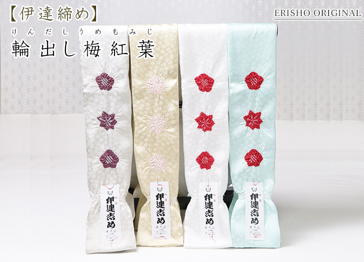 ![]() <その締め心地、言わずもがな・・・> もはやこの時代、このような伊達締めを制作ているのは、全国でゑり正だけではないかと心細くなる時がございます。 この伊達締めは、決して流行のお品物ではなく、 小花地紋の綸子地に、梅紅葉を片面に四ツづつ(合計八個)の輪出しを施したこの商品は、 この世の中、腰紐も伊達締めも、ピンからキリまでございます。
