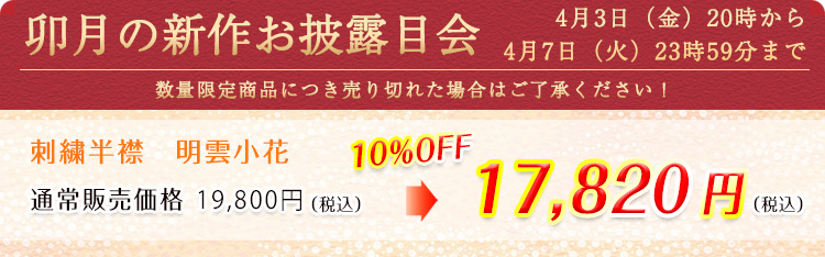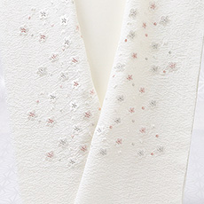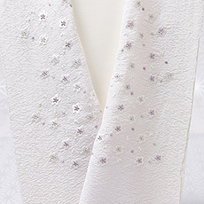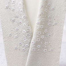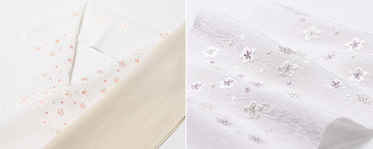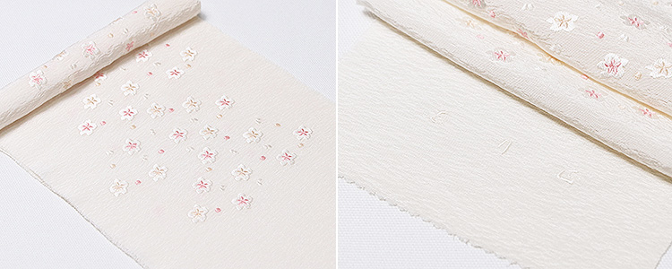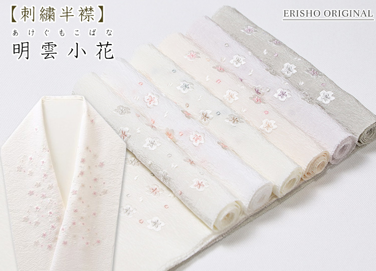 ![]() 生地素材はソフトなシボ立ちが魅力の京都丹後産の<明雲(あけぐも)地>を使用。 この刺繍下に使用した<明雲>という半襟は、 その明雲に、優しいトーンの配色で、小さな小花を散らしました。