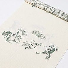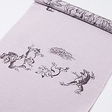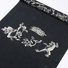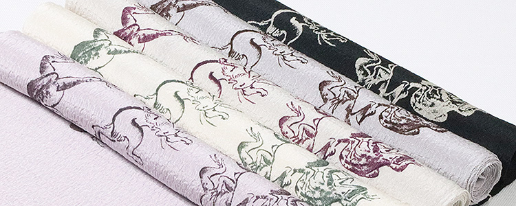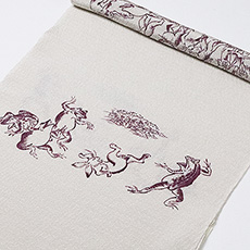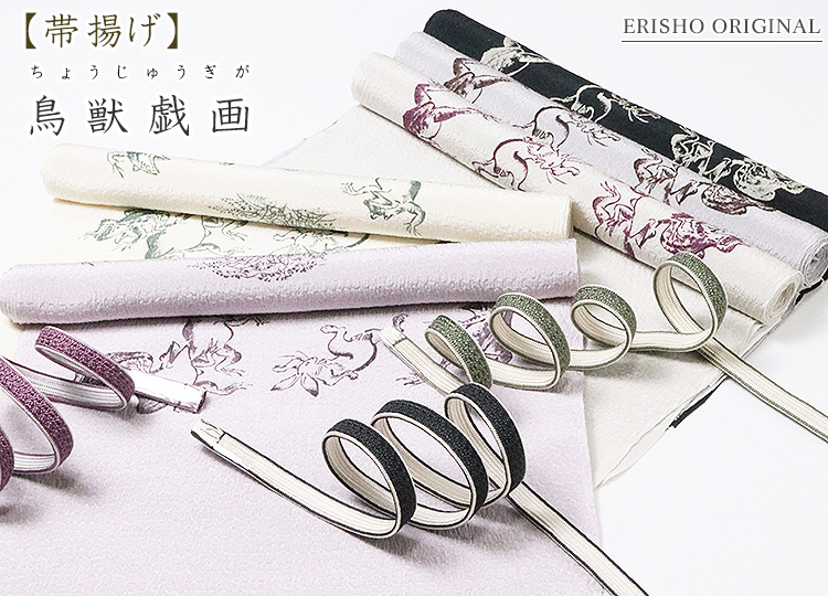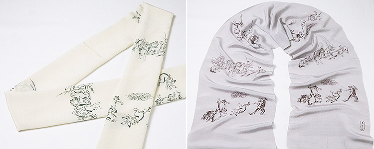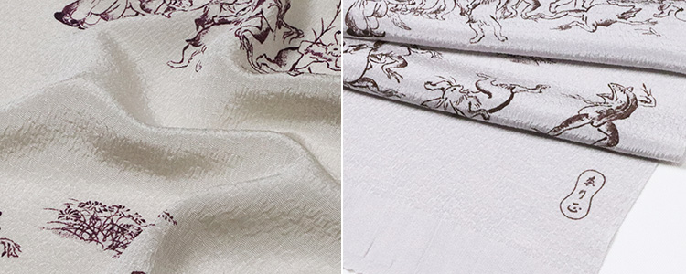 その生き生きとした動物のユーモラスなデザインに、 ファンも多い鳥獣戯画をモチーフにした帯揚げです。 生地は京都丹後産の<うずら縮緬>を使用。 しっかりとした風合いの最高級クラスの素材。 この独特のシボ立ちに鳥獣戯画が映える趣深い一品に仕上がっております。