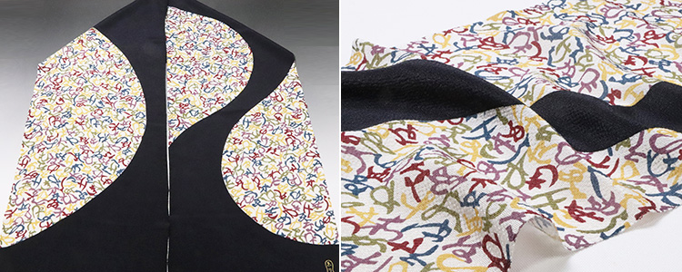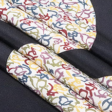弊店が半襟とペアで永年作製している< いろは歌 >の帯揚げ。 今回も綺麗に染まってまいりました!! この職人さん、仕事は綺麗なのですが仕事にかかられるまでがゆっくりな方なので なかなか納期が読めないのが難点。 しかし今のご時世、たとえ仕事のリズムがスローであっても こちらが依頼した色目を忠実に綺麗に染めてくれるということに対して 有り難いことなのだと思わなければならないのでしょう・・・。 納期の事は片目をつぶり細く永くお付き合いさせていただきたいものです。 生地は京都丹後産の重めの縮緬=通称<鬼シボ縮緬>を使用。 この帯揚げが醸し出す迫力のある意匠と色彩に 見劣りしないよう敢えてぽってりとした風合いの鬼シボ縮緬を使いました。 この<いろは歌>の帯揚げは、実に<型友禅>らしさが滲み出た味わい深い一品です。 オフホワイトに染めた地色に正倉院調の五色を型染めで染め上げたお手間入りの一品。 複雑に組み合わさった <いろは文字> がまるで生き物のように 楽しげな表情で表現されているのも型友禅という手仕事ならではの味。 染料の溜まりやカスレ具合も プリントでは決して表現できない手仕事ならではの 温かみのある風合いだと解釈していただければ幸いです。 また片面には大きな <半円>を、もう片面には<道長取り>という具合に アンシンメトリーな構図にしたのは和装小物専門店ゑり正としてのこだわりです。