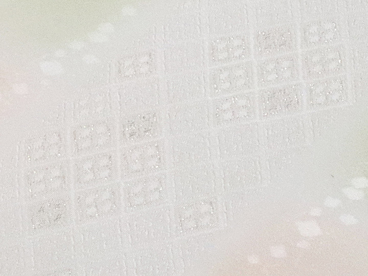 イメージとして一緒に写っている帯締めは<高麗耳付綾目二段ぼかし金散し 夏虫色/虹色(03)>でございます。