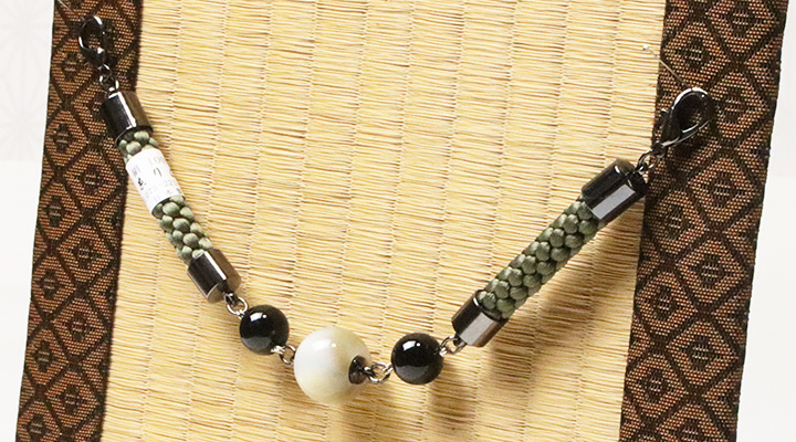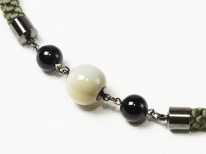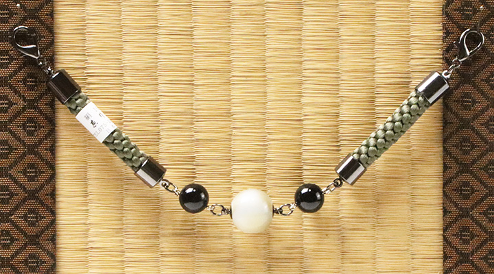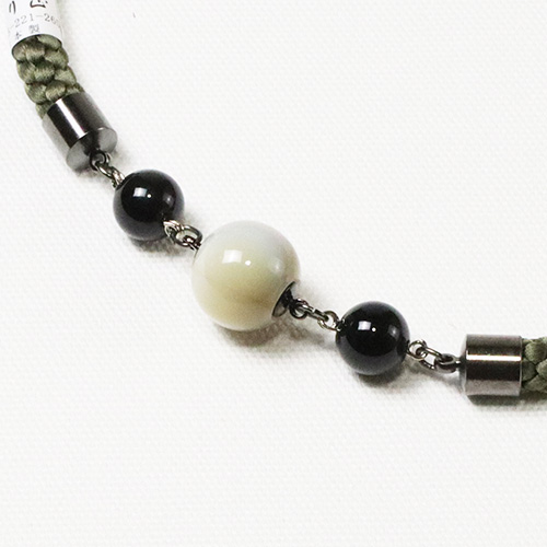紳士羽織紐 無双 マグネット 天然石/ラクト玉 カラー: 松葉緑/オニキス(03) 素材: 本体)絹100% 中央石)ラクト玉、側石)天然石、マグネット、カニカン