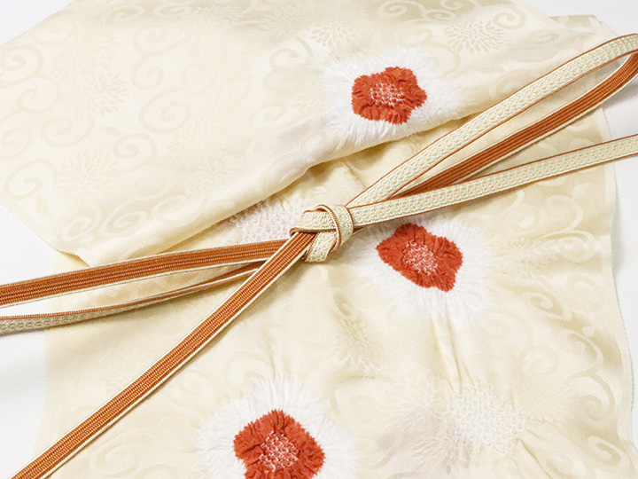 一緒に写っております帯揚げは、「輪出し白場取り小花 練色/黄櫨染(15)」でございます。