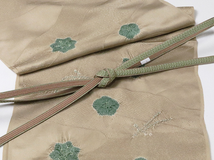 一緒に写っております帯揚げは、「輪出し吹き寄せ 空五倍子色/老竹色(26)」でございます。