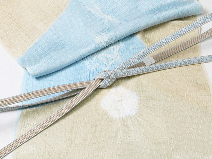 一緒に写っております帯揚げは、「染め分け梅紅葉 勿忘草色/白橡(03)」でございます。