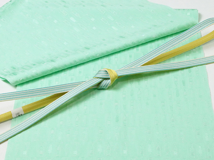 一緒に写っております帯締めは、「綾竹昼夜ストライプ撚房 ホライズンブルー・ホワイト/ミモザ(15)」でございます。