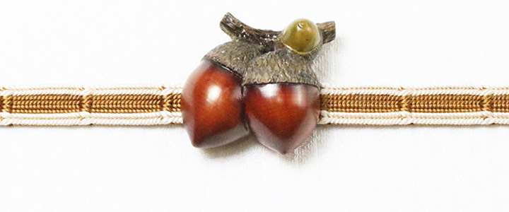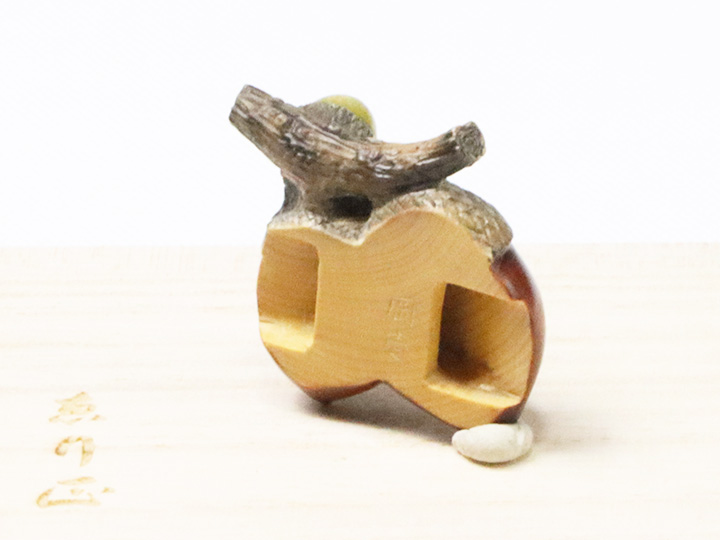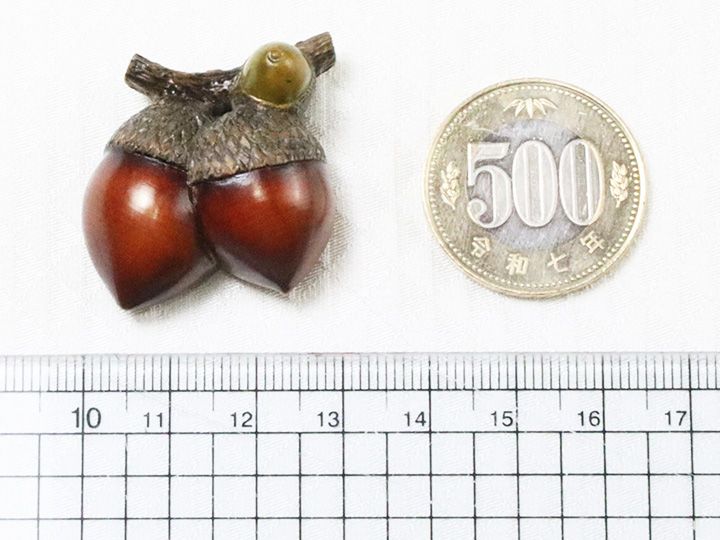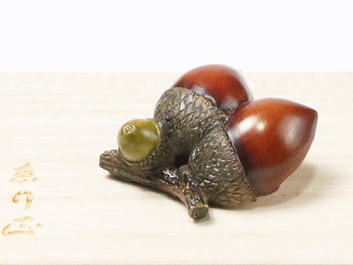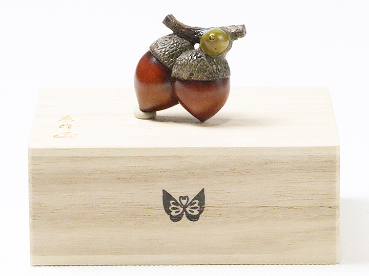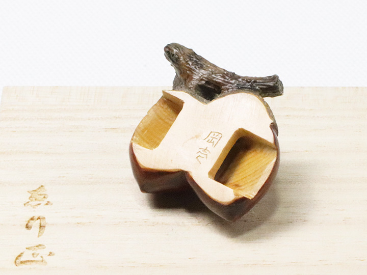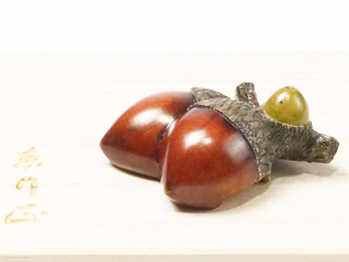 京都の根付師<岡壱>氏が手掛けられた<黄楊>素材の「双子団栗」の帯留め。