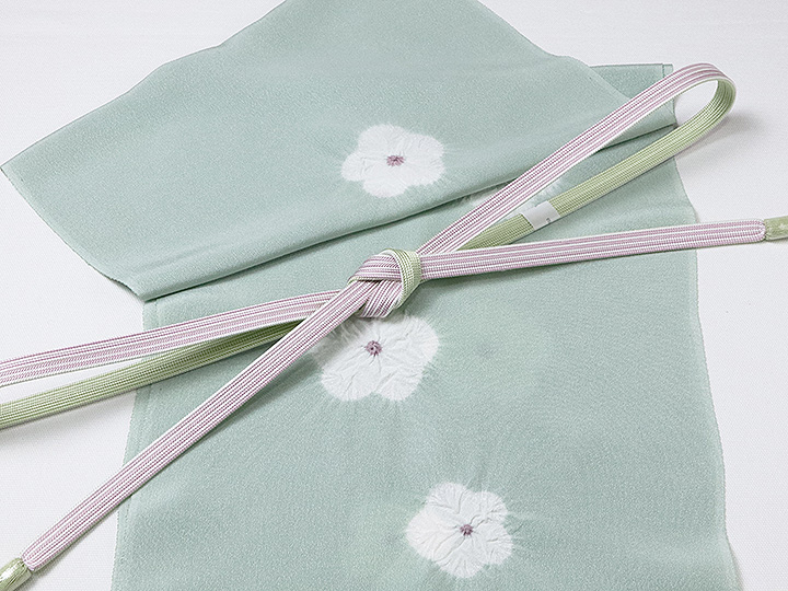 一緒に写っております帯締めは、「綾竹昼夜ストライプ撚房 薄葡萄・白/白緑(11)」でございます。