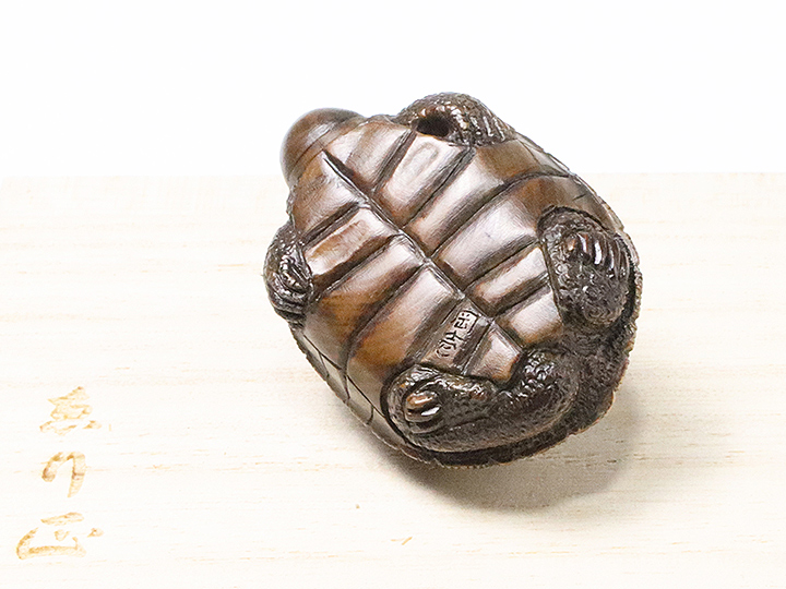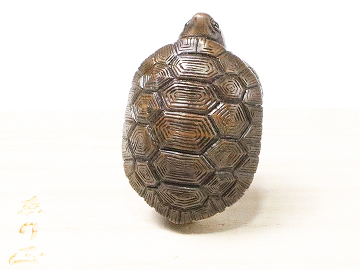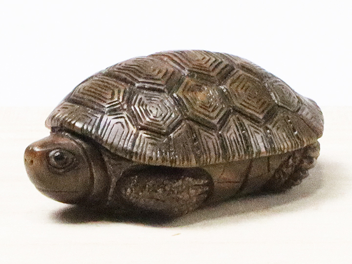 全体に茶色に染めつけられた亀の根付。そのユーモラスな表情が可愛いらしい。