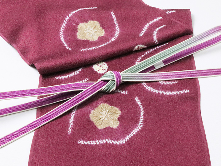 一緒に写っております帯締めは、「耳付綾竹二色ぼかし撚房 梅紫/緑青色(16)」でございます。