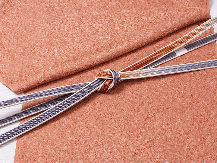 イメージとして写っております帯締めは、<耳付綾竹二色ぼかし撚房 紺鼠/柿渋色(05)>でございます。
