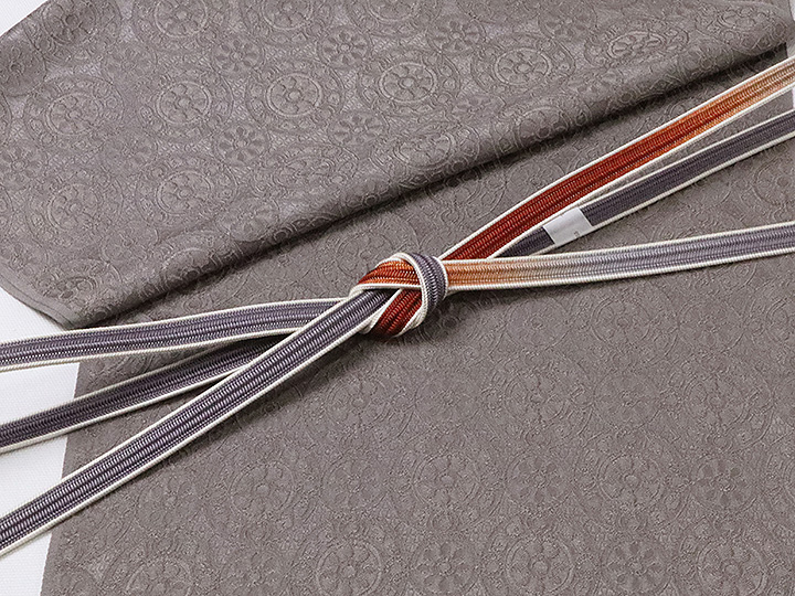 イメージとして写っております帯締めは、<耳付綾竹二色ぼかし撚房 藍墨茶/蘇芳(17)>でございます。
