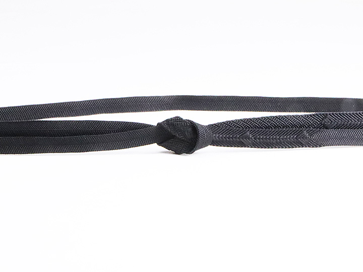 いざ探すとなかなか出会いが少ない喪服用の帯締め。 笹波組を途中で切り替えた凝ったデザインが黒字に浮かび上がります。 手組ならではの、適度な張りが感じられる、ワンクラス上の帯締めです。 細やかに構成された綾目がシンプルで美しい一品。