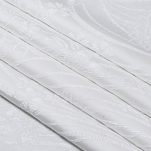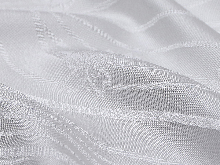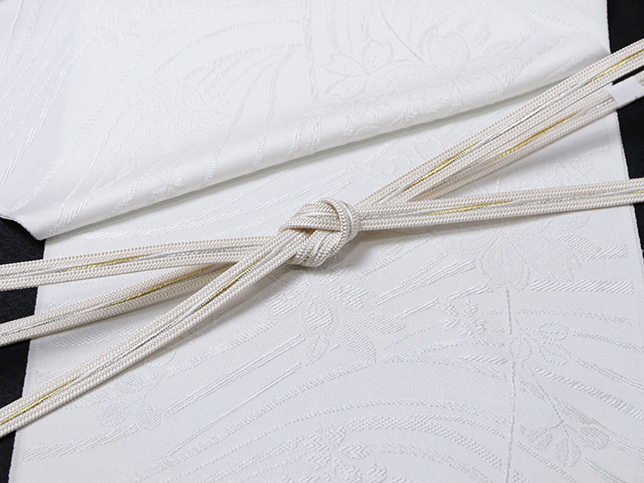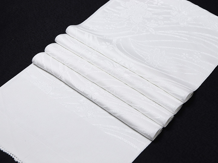 金糸が入っていない<白無地>の帯揚げをお探しのお客様も多いのではないでしょうか。 唐織ならではのふっくらとした織りの風合いと柄の陰影が美しい帯揚げ。 胸元をスッキリ白一色で潔く装うのも一興です。 帯揚げが白無地で少々物足りなさを感じる場合、 帯締めに金や銀の入ったものをお使いください。