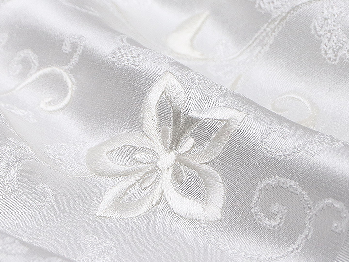 全体に花唐草を織り出した素材に、横振り刺繍を施したお手間いりの逸品。 横振りミシンならではの、ふっくらとした刺繍を胸元に添えてお出かけください。