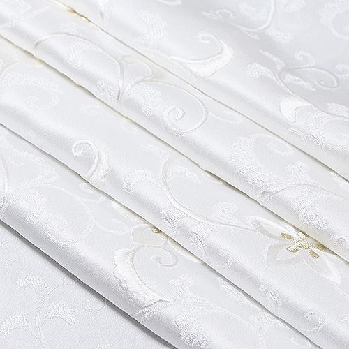 全体に花唐草を織り出した素材に、横振り刺繍を施したお手間いりの逸品。 横振りミシンならではの、ふっくらとした刺繍を胸元に添えてお出かけください。