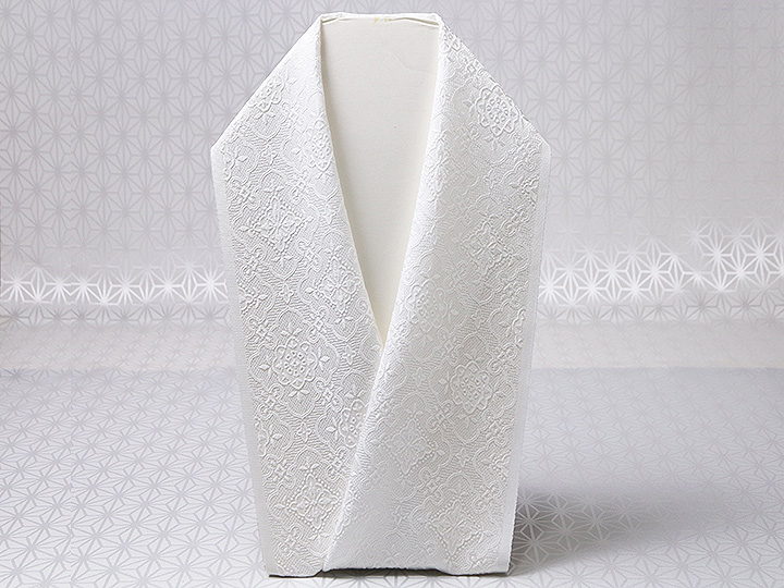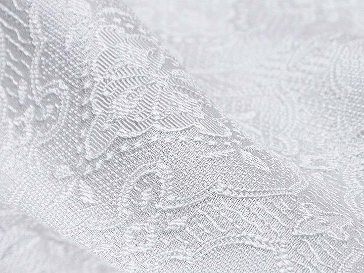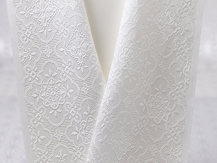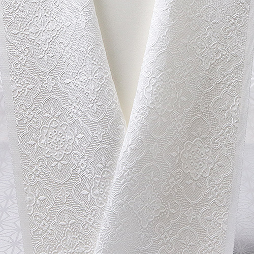 丹後の<風通三重織り>で仕上げた半襟は、その緻密な意匠の表現力が最大のポイント。 真っ白ではなく自然な白上げなので日本人の肌の色にも馴染みやすいホワイト仕上げです。 襟元の自然な陰影をお楽しみいただけると思います。