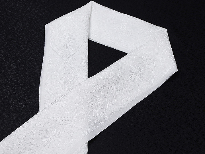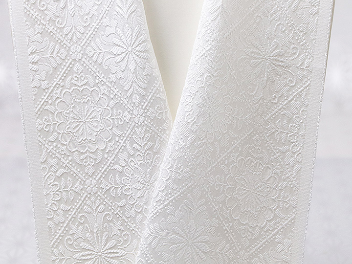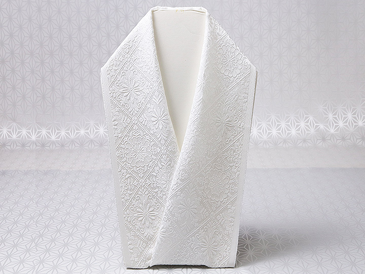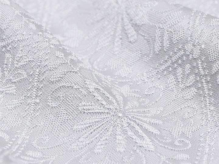 丹後の<風通三重織り>で仕上げた半襟は、その緻密な意匠の表現力が最大のポイント。 真っ白ではなく自然な白上げなので日本人の肌の色にも馴染みやすいホワイト仕上げです。 襟元の自然な陰影をお楽しみいただけると思います。