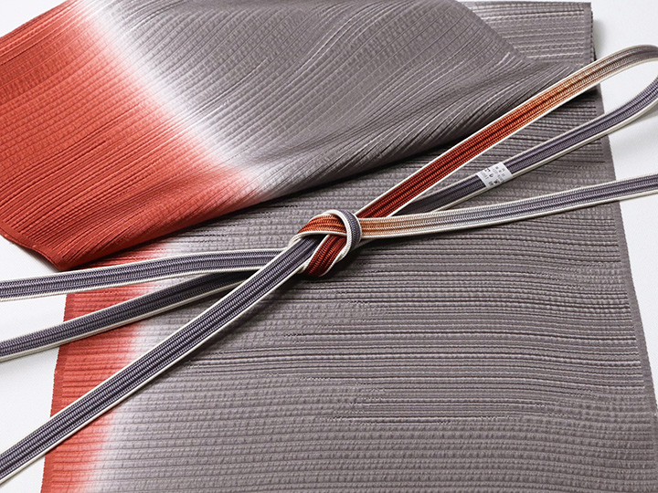 一緒に写っております帯締めは、「耳付綾竹二色ぼかし撚房 藍墨茶/蘇芳(17)」でございます。