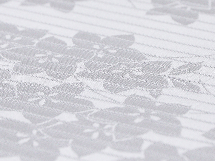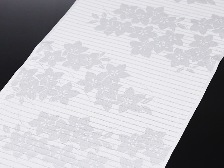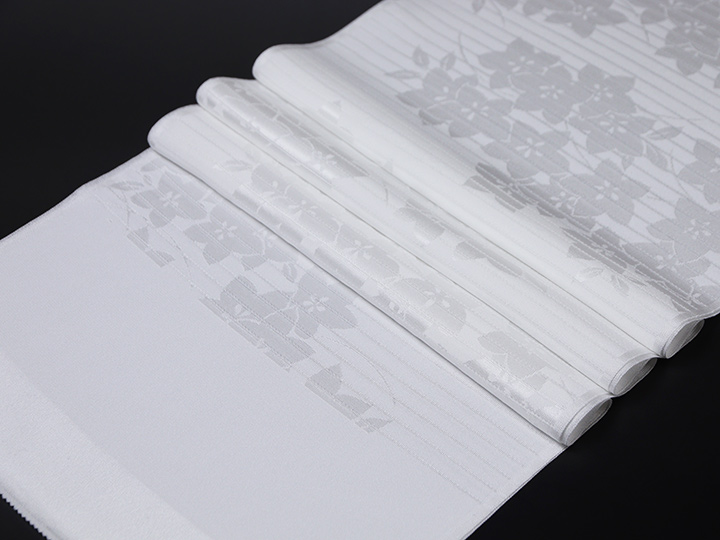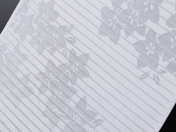 いざ探してみると、案外見つからないシンプルで潔い紋意匠白無地の帯揚げ。 織り出された桔梗の花が涼しげに映える、いかにも盛夏に相応しい夏の帯揚げです。